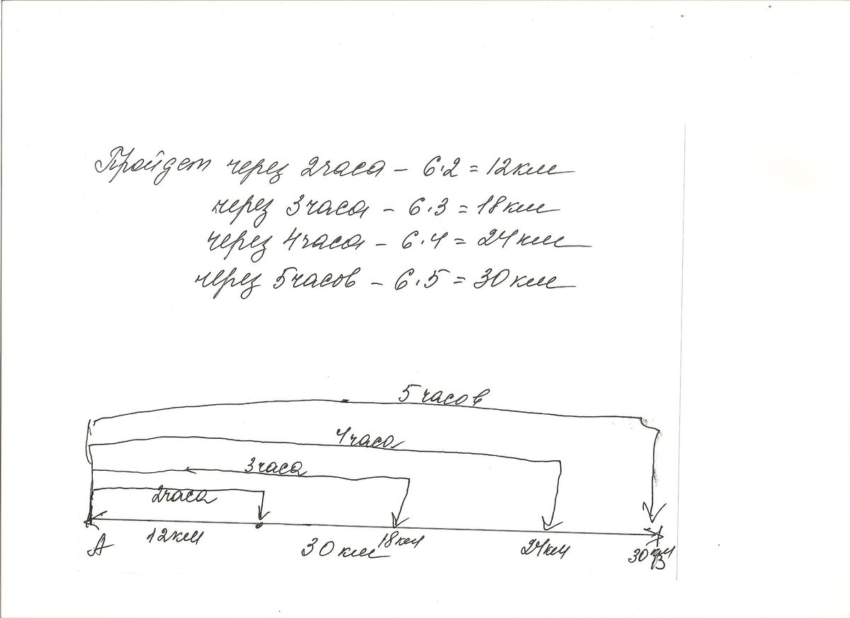 Расстояние между деревнями Ельнина и Соснова 30км.Изобразите дорогу види шкалы .Покажите где окажется пешихот идущий от Ельнина до Соснова соскорастью 6 км/ччерез 2 часа после выхода?Поепжите где он окажется через 3 часа,4часа,5часа. СРОЧНО СПАСИБО