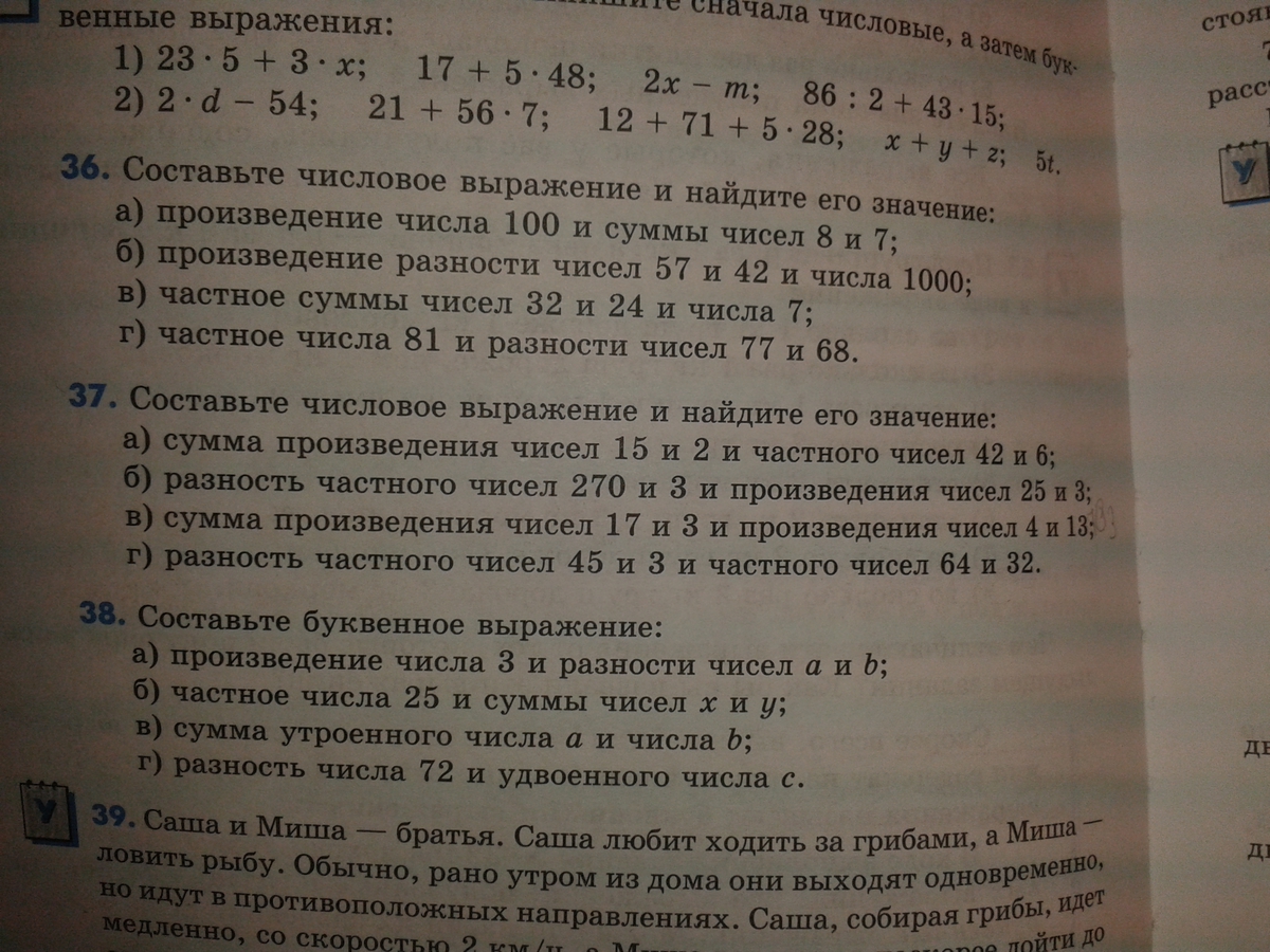 ПОМОГИТЕ!!!!! Составьте числовое выражение и найдите его значения а)сума произведения чисел 15и2 частного чисел 42 и6 б)разность Частного чисел 270 и 3 и произведения чисел 25 и 3 в) сумма произведения чисел 17 и 3 и произведения чисел 4 и 13 г) разность частного чисел 45 и 3 и частного чисел 64 и 32. упр 37