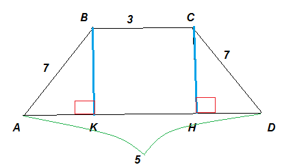 Дано: ABCD - равнобедренная трапеция, AB = CD =7 см. ВС = 3см, АD = 5см.