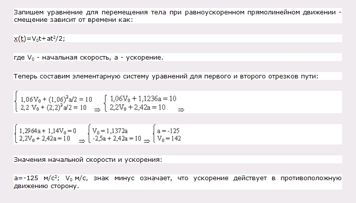 Тело, двигаясь равноускоренно, проходит последовательно два одинаковых отрезка пути длиной 10 м за времена 1,06 с и 2,2 с. Найти начальную скорость и ускорение тела