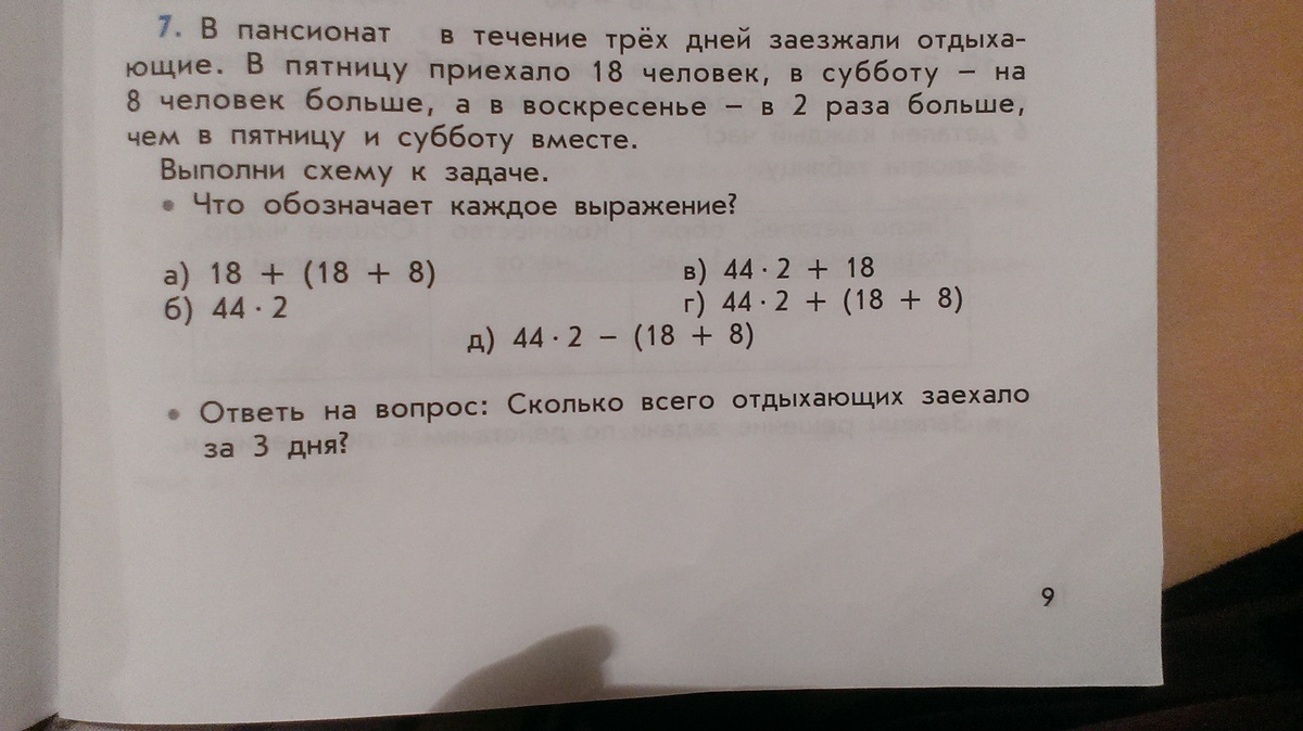 В пансионат в течение трёх дней заезжали отдыхающие.В пятницу приехало 18 человек,в субботу-на8человек больше,а в воскресенье-в2раза больше,чем в пятницу и субботу вместе.выполни схему к задаче.