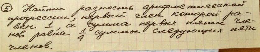 a_1=1,; S_{n}=frac{2a_1+d(n-1)}{2}cdot n; to ; S_5=frac{2+4d}{2}cdot 5=5(1+2d)=5+10d\\S_5=frac{1}{4}(a_6+a_7+a_8+a_9+a_{10}); ; [po; ysloviu]; to ; \\4S_5=(a_1+5d)+(a_1+6d)+(a_1_+7d)+(a_1+8d)+(a_1+9d)\\4(5+10d)=5a_1+35d\\20+40d=5+35d\\5d=-15\\d=-3
