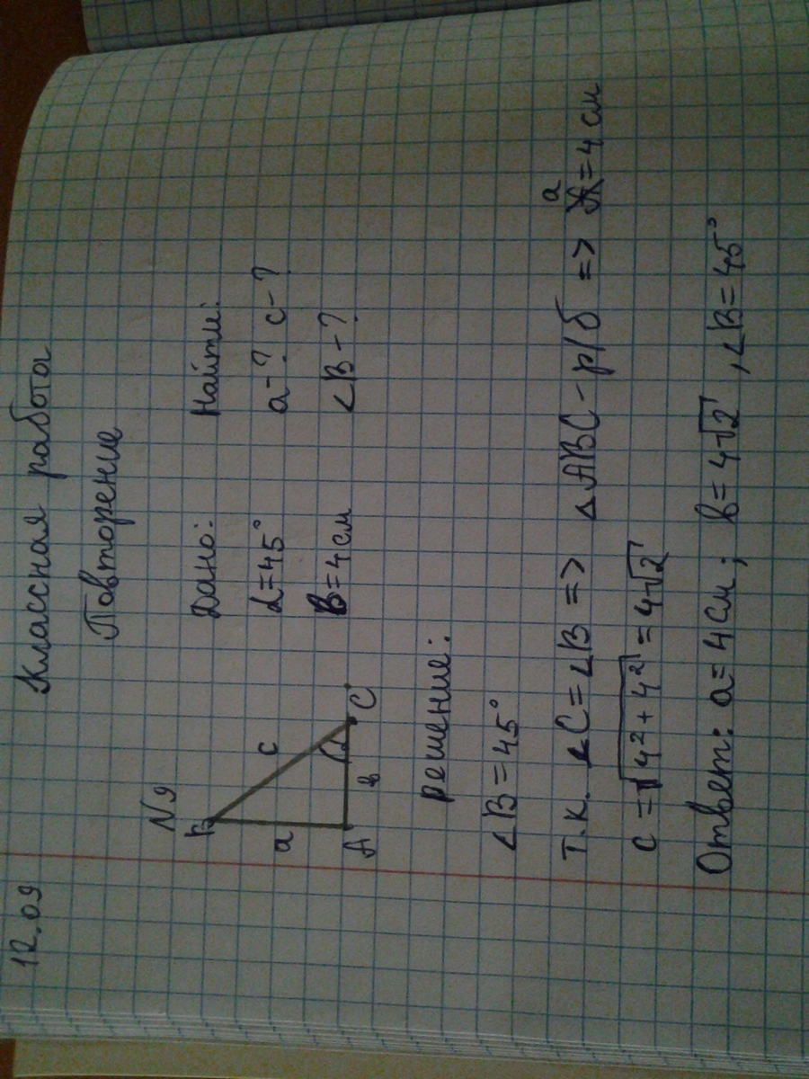 В прямоугольном треугольнике а и б-катеты, c - гипотенуза, а а-угол, противоположный катету а. Найдите неизвестные элементы по заданным: 1)а=12 см, с=13 см; 2)альфа=45°, б=4 см;