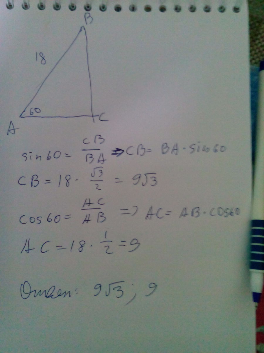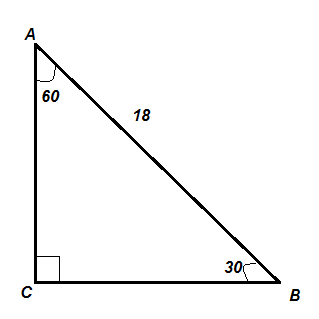 Дано: АВС - прямоугольный треугольник; Угол С =90 градусов. угол А = 60градусов. АВ = 18м