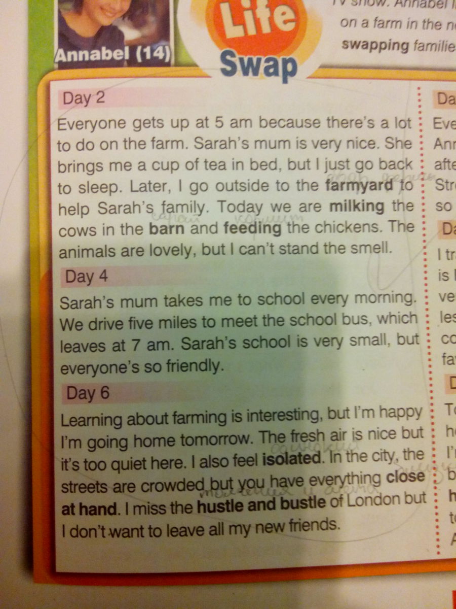 Все встают в 5 утра, потому что у них много работы на ферме. Мама Сары очень красивая. Она приносит мне чашку чая в постель, но я просто снова ложусь спать. Позже, я выхожу во двор фермы, чтобы помочь семье Сары. Сегодня мы доим коров в сарае и кормим цыплят. Животные прекрасны, но я не могу терпеть запах.