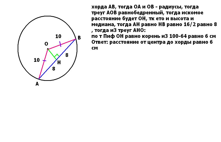 в окружности с центром О и радиусом, равным 10 см, проведена хорда МР, равная 16 см. Найти расстояние от центра окружности до хорды.
