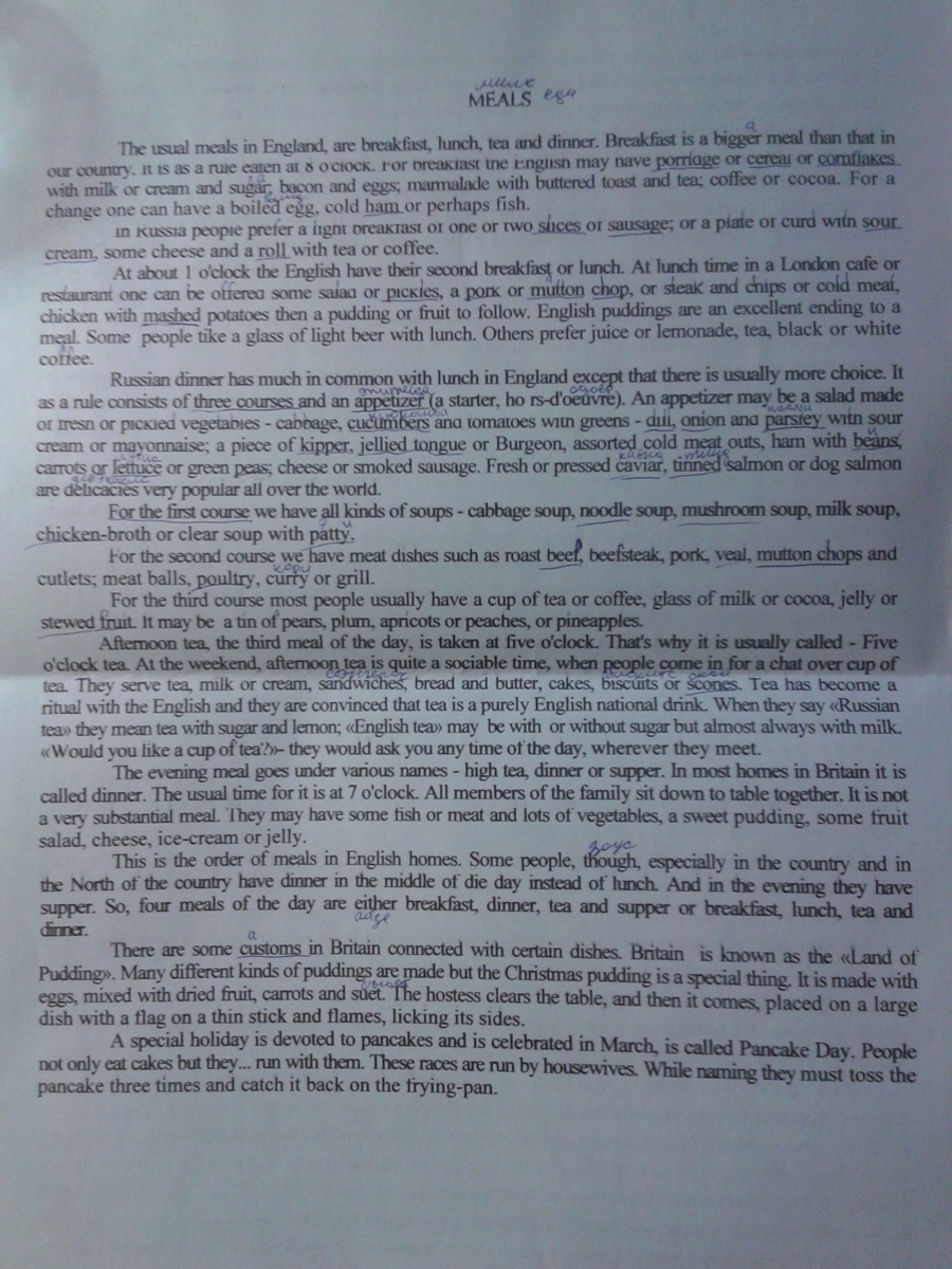 Завтрак, ланч, чай и обед — обычные приемы пищи в Англии. Англичане очень разборчивы в еде и строго придерживаются определенного времени приема пищи. Время завтрака между 7 и 9 часами утра. Многие любят начинать его с овсяной каши. Англичане едят овсянку с молоком или сливками и сахаром, но ни один шотландец — а овсянка появилась именно в Шотландии — не положит сахар в кашу. Затем едят яичницу с беконом, повидло с тостами и чай или кофе. Для разнообразия можно съесть вареное яйцо, холодную ветчину или рыбу. Два самых больших приема пищи в день, ланч и обед, похожи между собой. Время ланча — час дня. Многим из тех, кто работает, трудно приходить домой на ланч, и они идут в кафе или ресторан, но никогда не пропустят приема пищи. На ланч едят много — мясо или рыбу, картофель и салат, пудинги или фрукты. Днем, около четырех часов, англичане пьют чай с тортом или кусочком или двумя хлеба с маслом. Чай очень популярен у англичан, его можно назвать их национальным напитком. Англичане любят крепкий, свежезаваренный чай. Чай следует заваривать следующим образом: одна чайная ложка на каждого человека и одна на чайник. Они пьют чай с сахаром или без, но почти всегда с молоком. Очень важно, что нужно наливать чай в молоко, а не наоборот. Очень известен их «большой чай» в пять часов вечера, когда к чаю подают ветчину, помидоры и салат, хлеб с маслом, фрукты и пирожные. Время обеда — около половины восьмого или позже. В некоторых домах обед — самый большой прием пищи за день. Он начинается с супа, затем идет рыба, жареный цыпленок, картофель с овощами, фрукты и кофе. Но в большинстве английских семей главный прием пищи — в середине дня, а вечером едят что-нибудь легкое, например, хлеб с сыром и кофе или какао с фруктами.