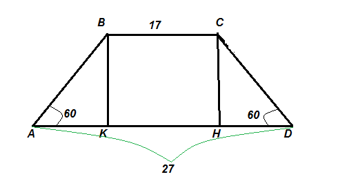 Дано: ABCD - равнобокая трапеция, ВС = 17см, AD = 27см. угол А=углу D = 60 градусов