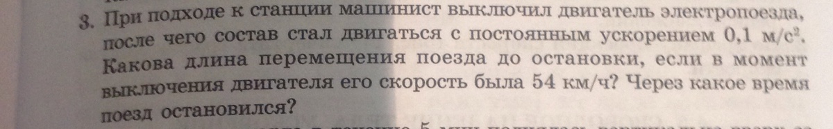 Дано Vo=54 км/ч=15 м/с a=-0,1 м/с2 V=0 S - ? t- ?