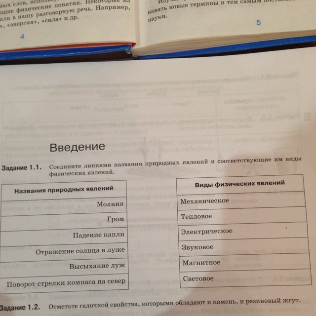 Молния - электр., гром- звук., падение капли- звук., отражение- свет., высыхание луж - тепловое, компас- магнитное.
