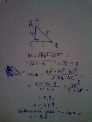 В треугольнике АВС угол С равен 90 градусов, АВ=5, АС=4. Найдите синус внешнего угла при вершине А