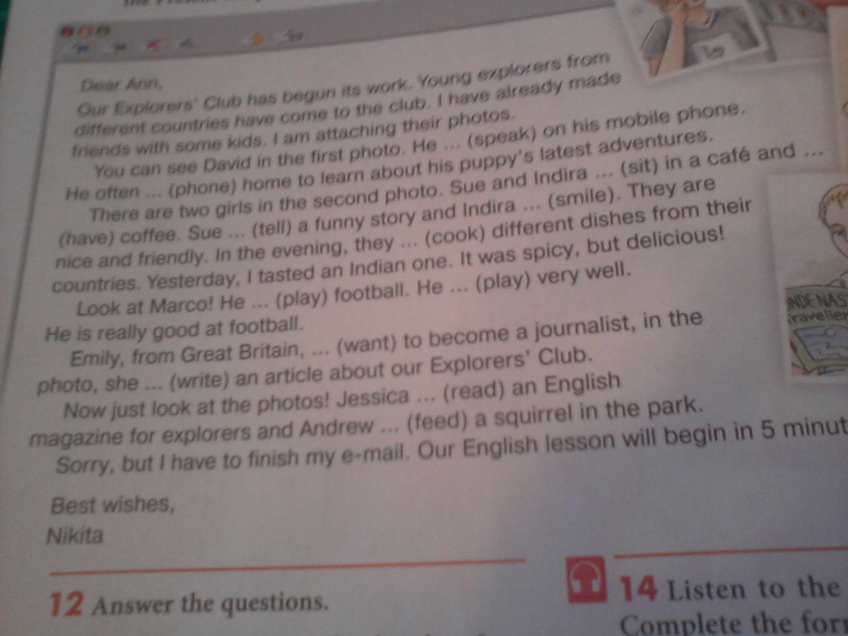 сейчас взгляни на фото. Джессика читает английский журнал для исследователей и Эндрью кормит белку в парке.