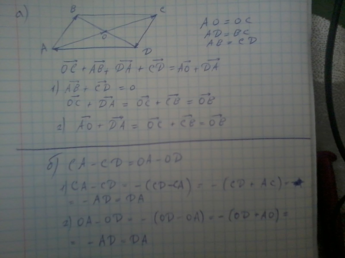 АВСD- параллелограмм, О- точка пересечения диагоналей. Докажите,что: а)(векторы)ОС+ АВ+DA+CD=AO +DA; б)(векторы) CA-CD=OA-OD.