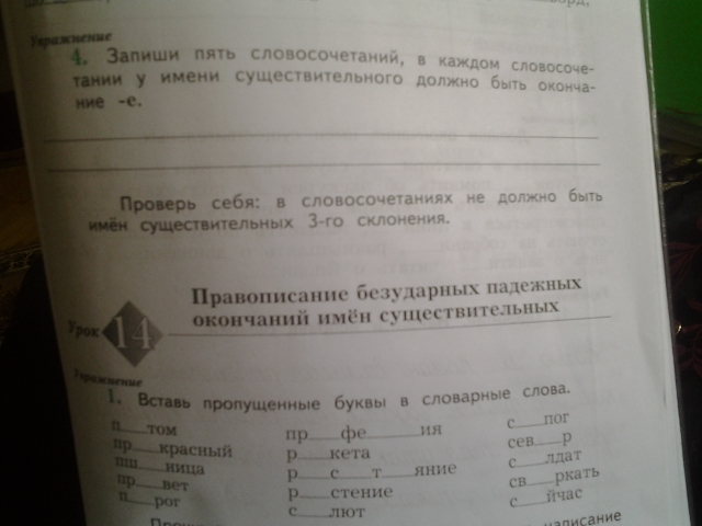 запиши пять словосочетаний , в каждом словосочетании у имен существительного должно быть окончание -е