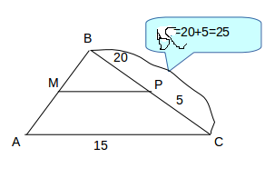 Дано: ABC - треугольник, точки М и Р - (пусть средины сторон) АВ и ВС, МР || АС. BP = 20см, РС = 5см, АС = 15см.