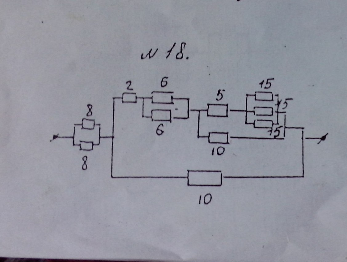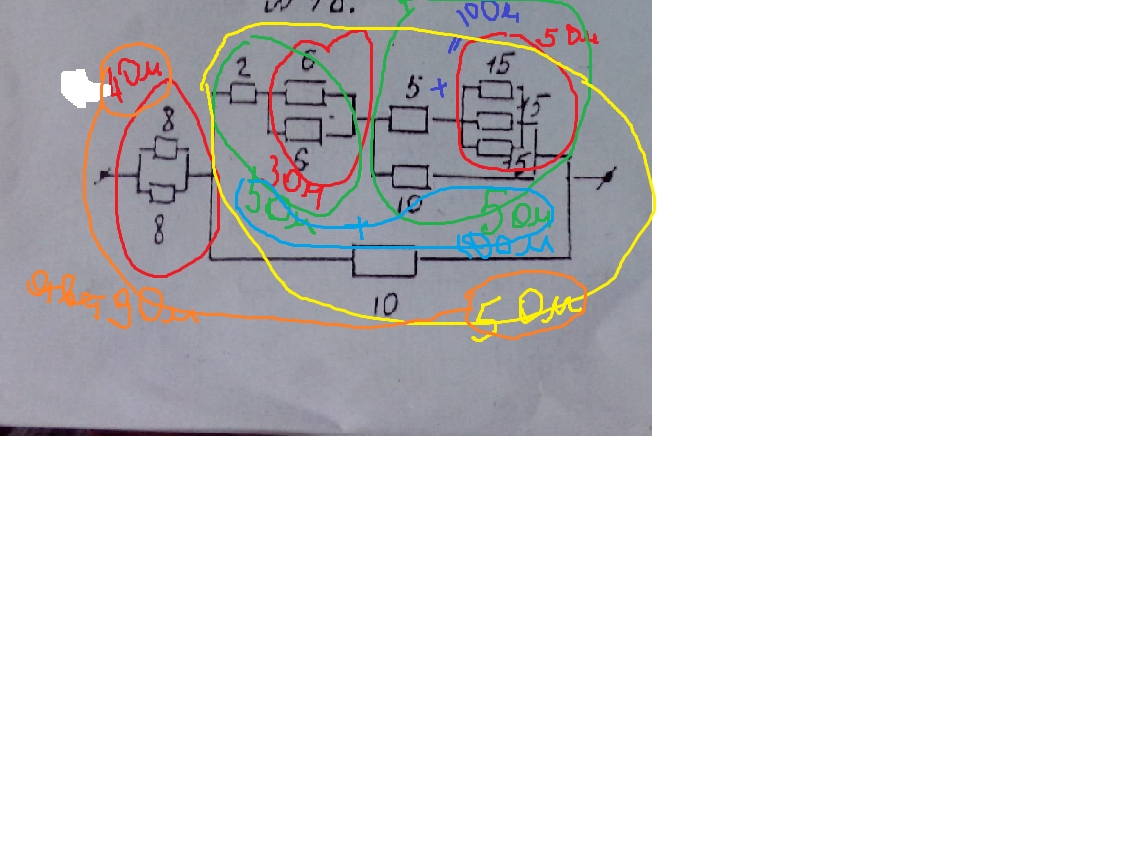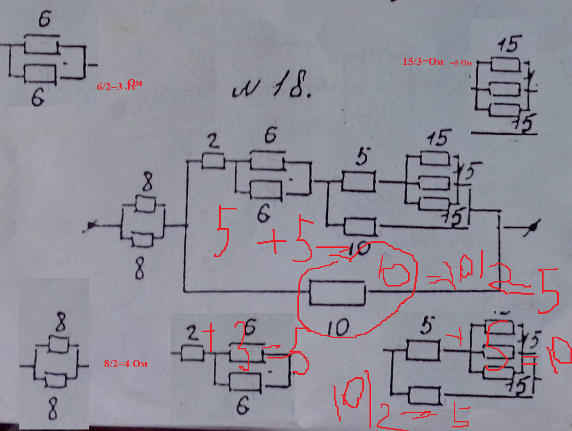 1. блок 3 по 15 сопротивление равно 15/3=5 Ом (красная)