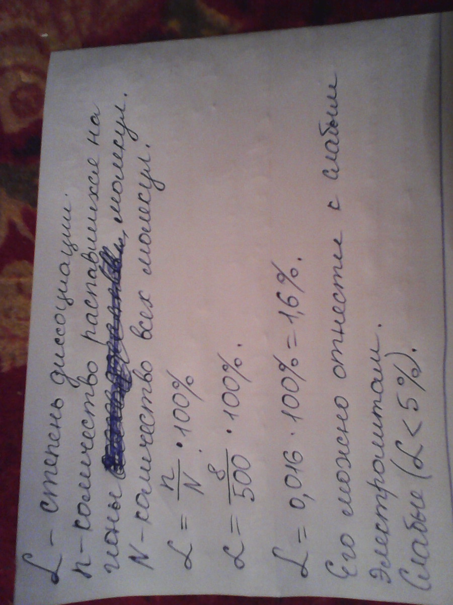 из каждых 500 молекул некоторого электролита 8 распадаются на ионы.Чему равна степень диссоциации данного электролита?К электролитам такого типа (сильным или слабым)его можно отнести?