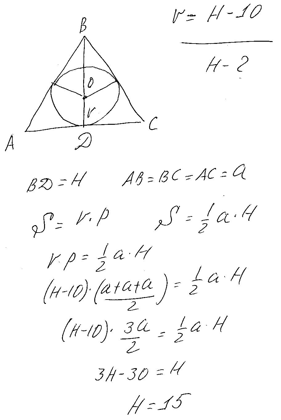 Радиус окружности, вписанной в равносторонний треугольник на 10 см меньше, чем высота треугольника.Найдите высоту треугольника.