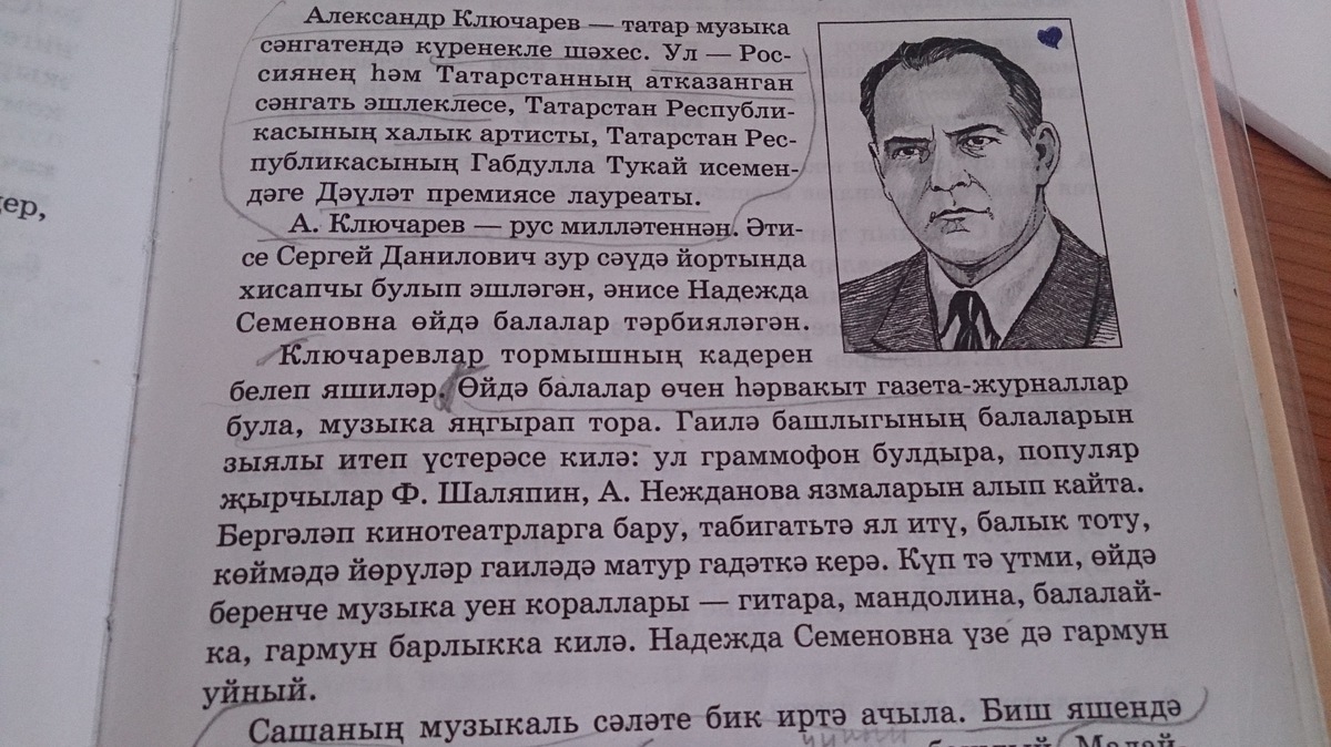 Александр Ключарев- известная персона.Он заслуженный искусствовед,народный артист.Он-лауреат премии.А.Ключарев русской национальности.Ключаревы живут бережно.Дома ради детей всегда лежат газеты,журналы,звучит красивая музыка.Музыкальные спапобности рано начинаются.Когда ему было пять лет он начинает играть на гормоне.Ему не хвотает силы поднять гормонь.Он ставит гормонь на стул и начинает играть. Когда Ключарев начал учится в гемназии он начал учиться играть на скрипке и на пианино.Александр закончил училище и начал работать в театре. Для народа пишет инструментальную музыку.Для детей есть лирические песни,симфония,балет.