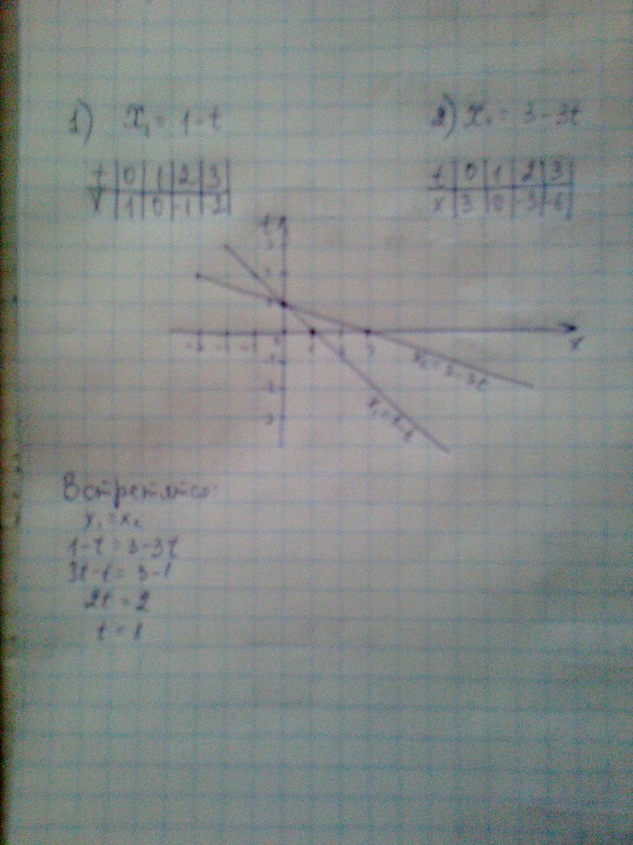 Даны уравнения движения двух тел: х1=1-t и х2=3-3t. Построите графики движение этих тел и определите место и время их встречи графически и аналитически.