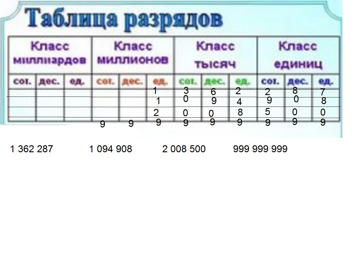 запиши в таблицу разрядов и классов следующие числа.