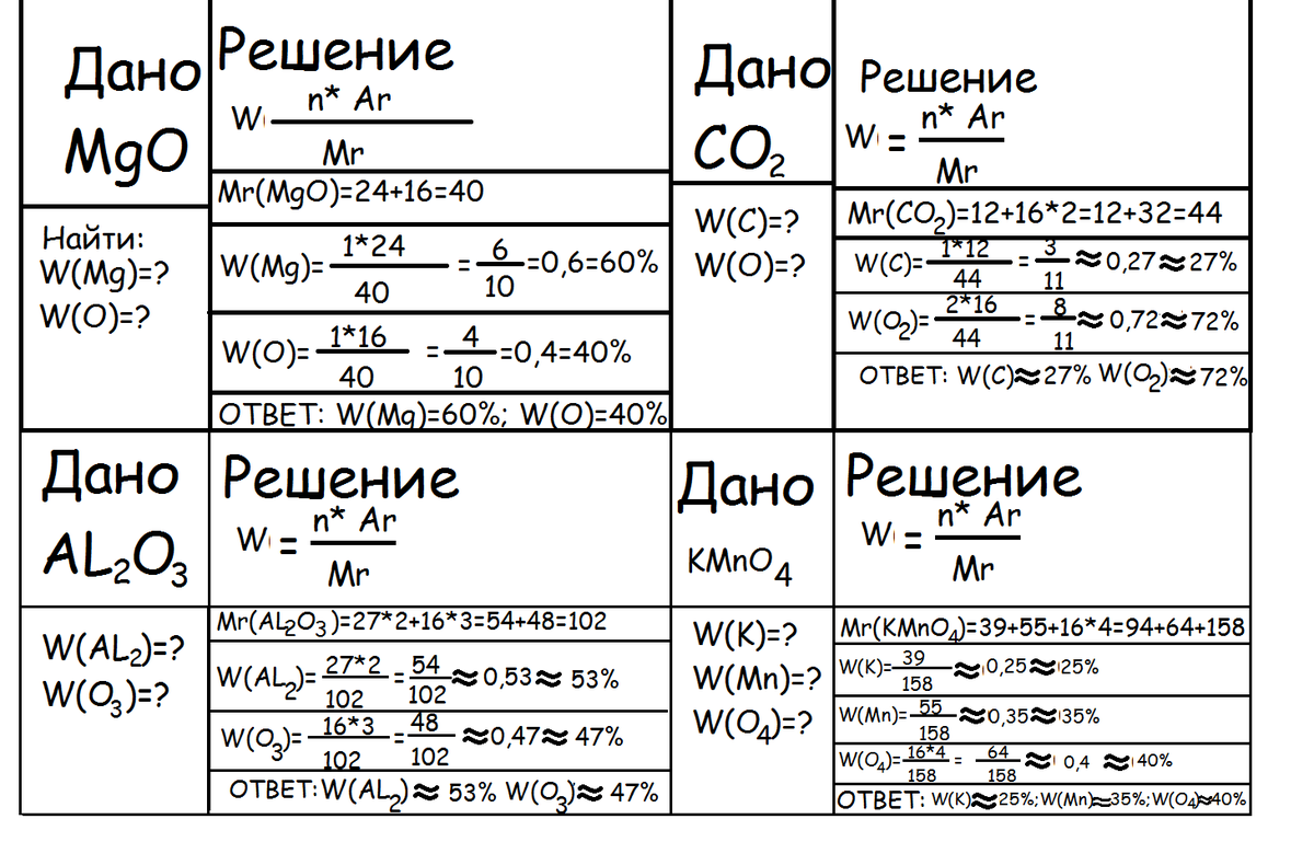 ХИМИЯ! Вычислите массовые доли каждого элемента в следующих соединениях: MgO, CO2, Al2O3, KMnO4 ?