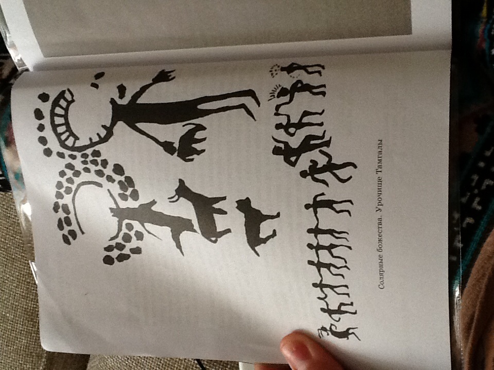 Тут изображены два солнцеголовых существа.Головы у них в виде солнца,но они имеют и черты человека-тело.Солнце означало для древних тюркских народов начало жизни,а также источник света.Здесь изображены ритуальные танцы,жертвоприношение,дикие (олень) и домашние(собака) животные.