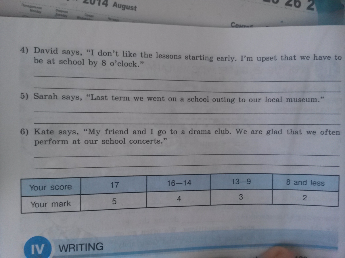 4 David says that he doesn't like the lessons staring early. He's upset that they have to be at school by 8 o'clock.