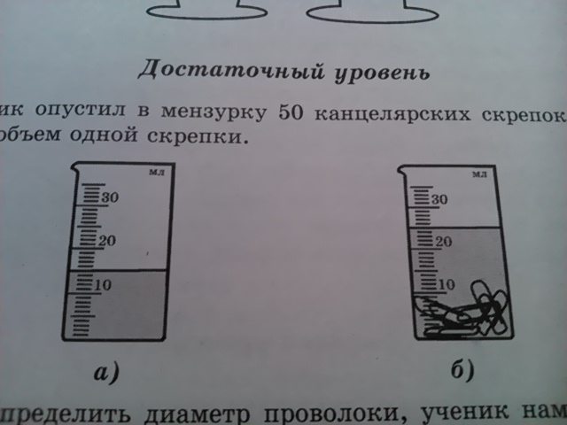 Объём изменился на 10, значит 10/50(количество скрепок в мензурке) = 0,2( V 1 cкрепки)
