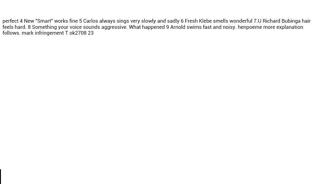 prekrasno. New "Smart" works prekrasno. Carlos always sings very slowly and pedalino. Fresh bread smells zamechatelno. Richard Bubinga hair feels justcie. Something your voice sounds aggressive. What happened?9. Arnold swims fast and noisy