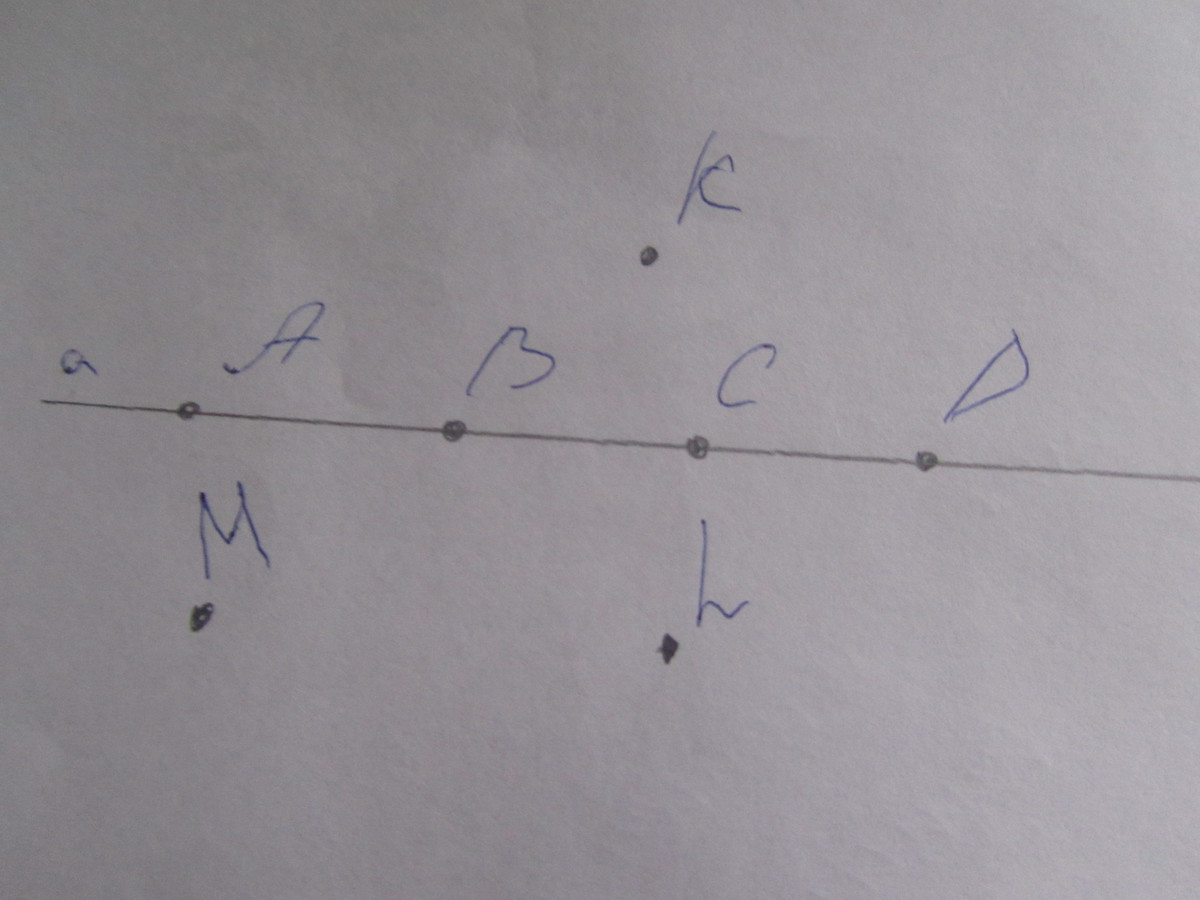 начертите прямую и отметте 3 точки,не лежащие на этой прямой,и 4 точки,лежащие на ней.обозначте точки буквами