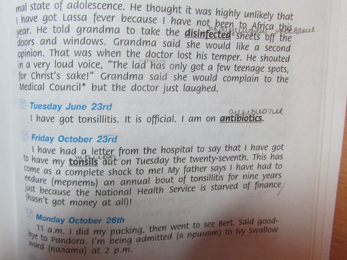 - Доктор сказал, что Адриан страдает от угревой сыпи и что это нормальное состояние у подростков. Доктор сказал, что было бы плохо если бы у Адриана была бы лихорадка Ласса, но Адриан не была в Африке и не мог её подхватить. Он сказал его бабушке продезинфицировать простыни двери и окна. Доктор потеряв терпение прокричал громким голосом: "Бога ради, да у парня просто пара подростковых прыщей!" На слова бабушки он просто рассмеялся. Я думаю, что Адриан был действительно слишком обеспокоен, но доктор повёл себя очень грубо по отношению к бабушке Адриана. Это не её вина, она просто хотела помочь своему внуку. Доктор мог бы быть более вежливым с пожилой дамой.
