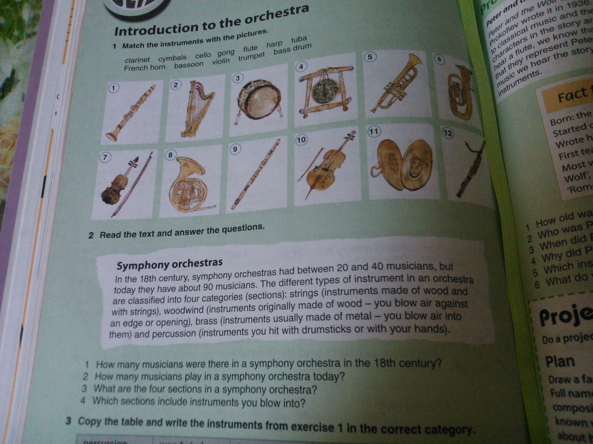 3 The four sections in a symphony orchestra are strings, woodwind, brass, percussions.