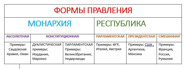 Монархия включает в себя Абсолютную монархию (Оман) и Конституционную. Конституционная монархия бывает двух видов: 1. Дуалистическая (Иордания) и Парламентская (Великобритания).