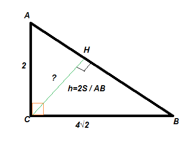 в прямоугольном треугольнике abc угол c 90,AC=2,BC=4^2.Найти длину высоты треугольника,проведенной к гипотенузе