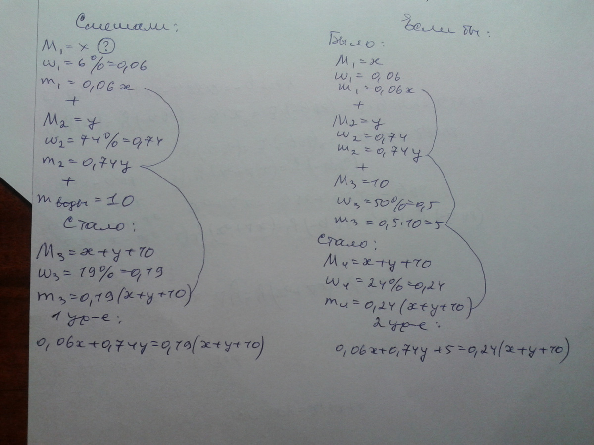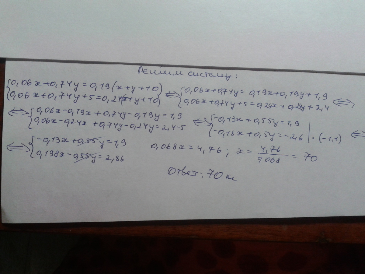 Смешав 6-процентный и 74-процентный растворы кислоты и добавив 10 кг чистой воды, получили 19-процентный раствор кислоты. Если бы вместо 10 кг воды добавили 10 кг 50-процентного раствора той же кислоты, то получили бы 24-процентный раствор кислоты. Сколько килограммов 6-процентного раствора использовали для получения смеси?