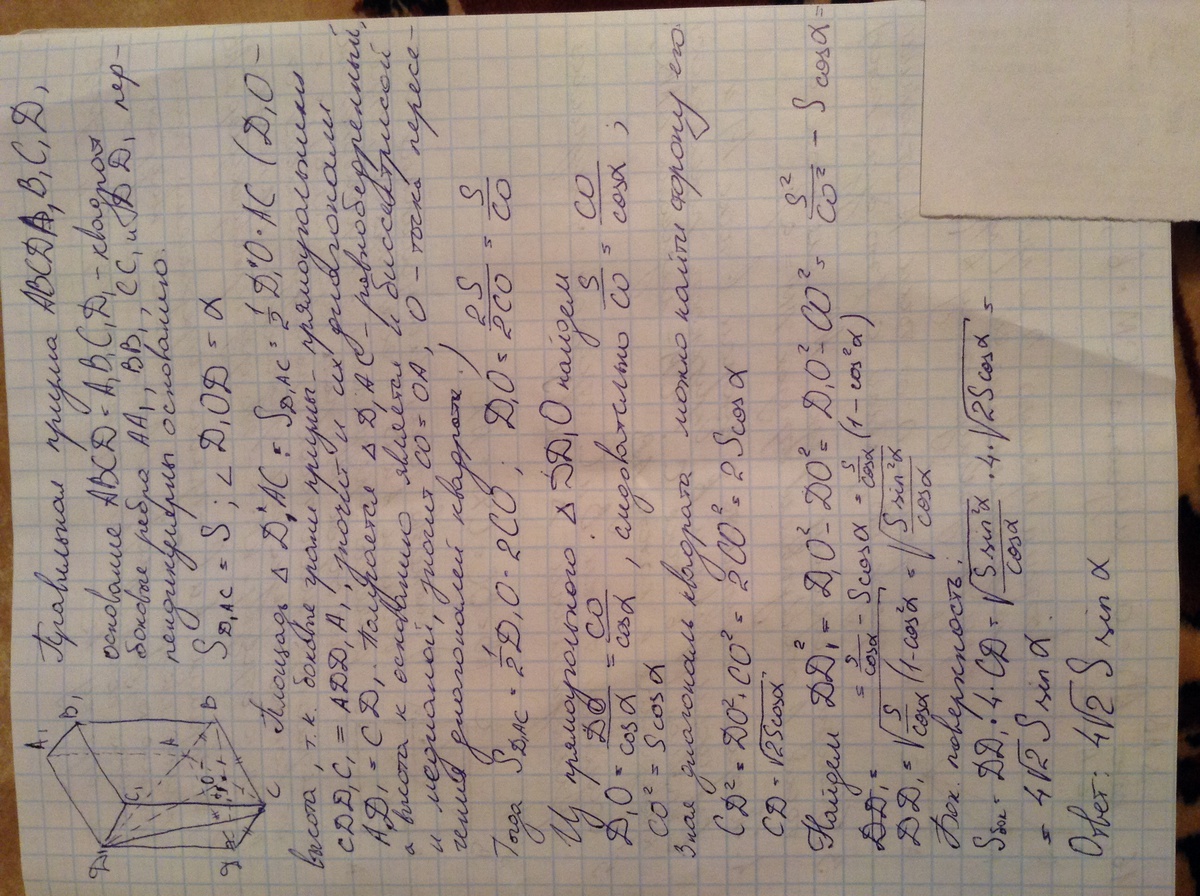 В правильной четырехугольной призме abcda1b1c1d1 через вершину d1 и диаагональ основания ac проведено сечение площадью S,образующее с плоскостью основанияугол α. найдите боковую поверхность призмы