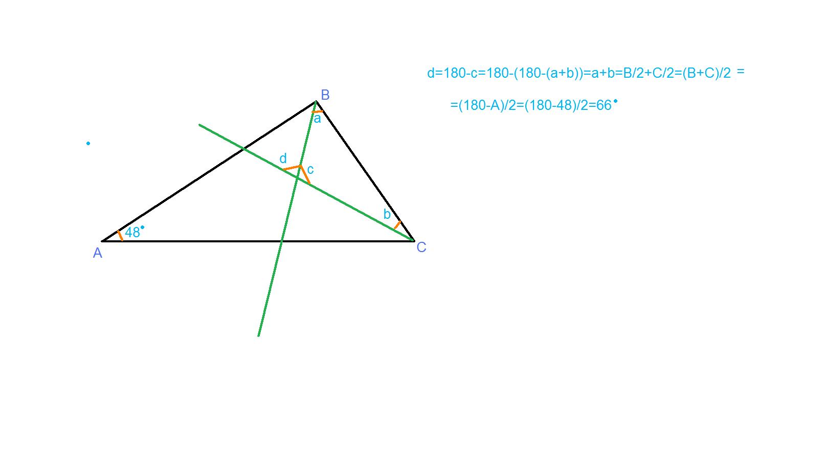 один из углов треугольника равен 48°.Найдите острый угол, образованный биссектрисами двух других углов этого треугольника.