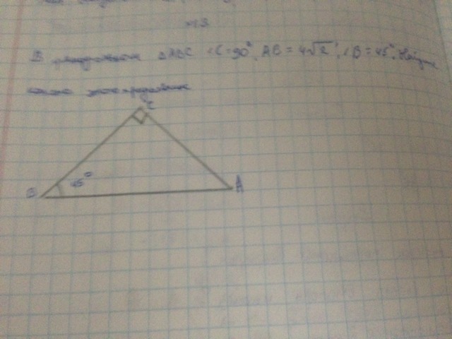 Решите в прямоугольном треугольнике авс, угол с=90градусов, ав=4квадратный корень из двух, угол в равен 45 градусов.Найдите катеты этого треугольника.
