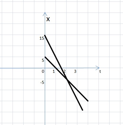 даны уравнения движения двух тел x1=5-5t x2=15-10t.постройте график движения этих тел и определите место и время их встречи графически и аналитически