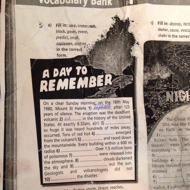 1) erupted 2) event 3) explosion 4) lava 5) crater 6) was destroyed 7) gases 8) ash 9) blocked 10) predict