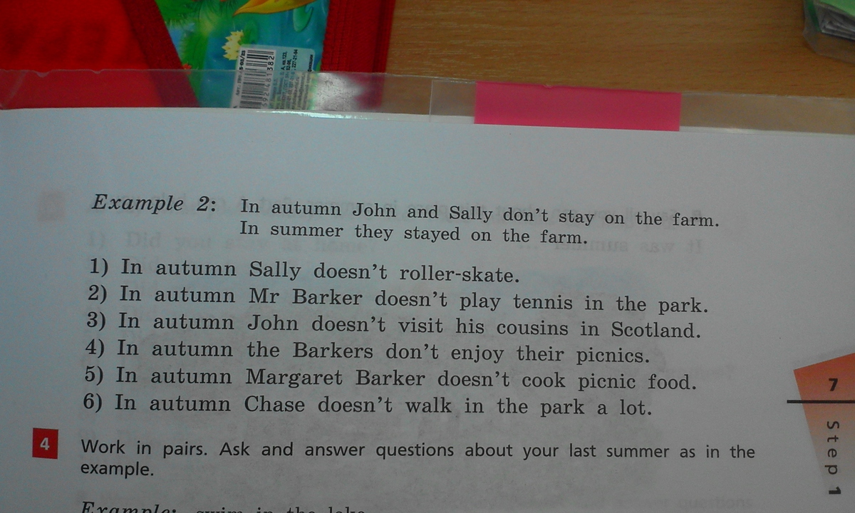 1) Осенью Шелли не сможет кататься на ролликах. 2) Осенью Мистер Бейкер не сможет играть в теннис в парке. 3) Осенью Джон не сможет навестить своих кузин в Шотландии. 4) Осенью Бейкеры не смогут наслаждаться пикниками. 5) Осенью Маргарет Баркер не сможет приготовить еду для пикника. 6) Осенью Чейс не сможет гулять много в парке.