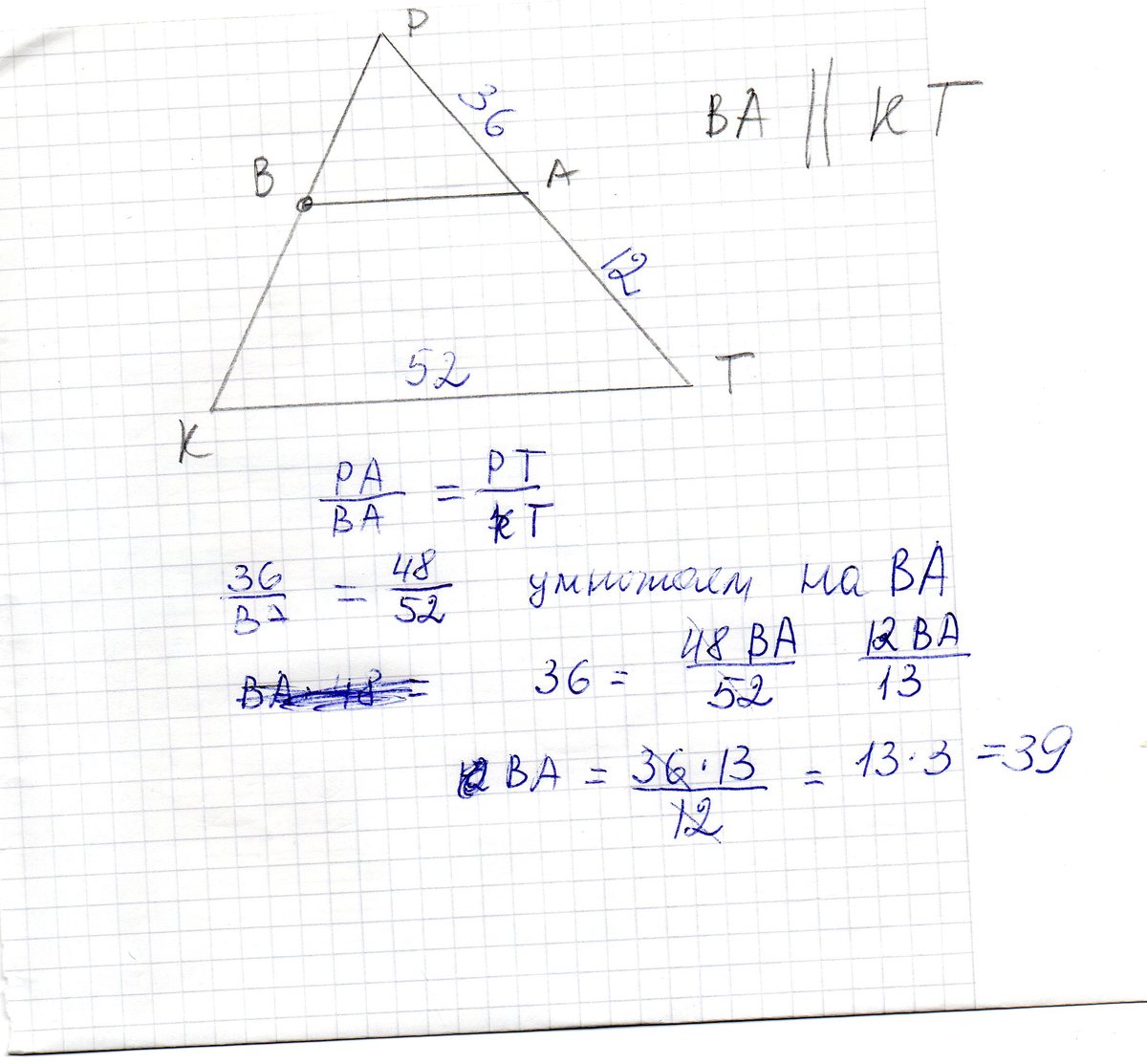 через точку B стороны PK треугольника KTP проведена прямая,параллельная стороне TK и пересекающая сторону PT в точке A.Вычислите длину отрезка AB,если KT=52см, AT=12см, AP=36см.