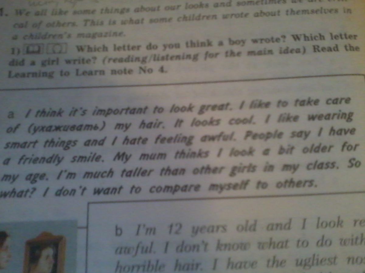 a) Я думаю это важно выглядеть отлично. Я люблю ухадивать за своими волосами. Это круто выглядит. Я люблю носить шикарные вещи и я ненавижу ощущать себя ужасно. Люди говорят что у меня дружелюбная улыбка. Моя мама думает что я выгляжу чуть старше своего возраста. Я намного выше чем другие девушки в моём классе. И что? Я не хочу сравнивать себя с другими.