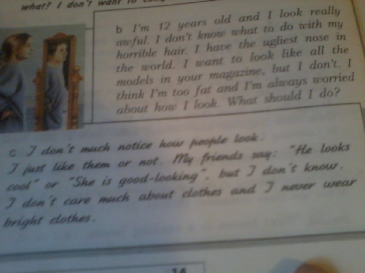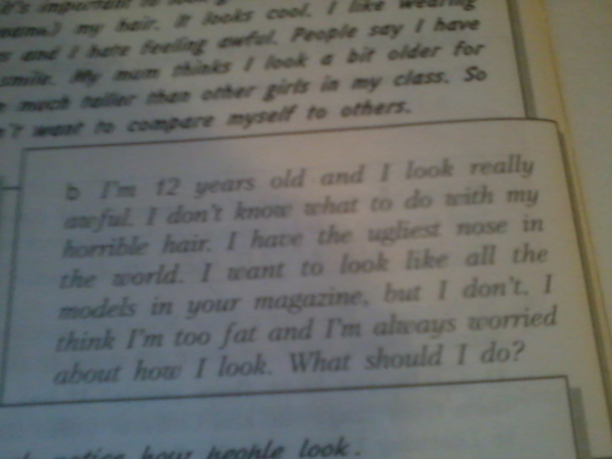 b) Мне 12 лет и я реально ужасно выгляжу. Я не знаю что делать со своими ужасными волосами. У меня самый уродливый нос в мире. Я хочу выглядеть как все модели в ваших журналах, но я так не выгляжу. Я думаю что я слишком толстая и я всегда беспокоюсь за то, как я выгляжу. Что я должна делать?