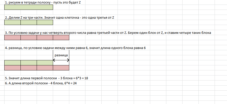 По другому: Вам скорее всего надо нарисовать даже ваше решение. Рисуете четыре блока, под ними три блока такой же длины. По условию задачи блоки одинаковые, короткая полоска на 6 короче, чем длинная, значит короткая полоска состоящая из трех блоков имеет длину 18. Рисунок сейчас прикреплю