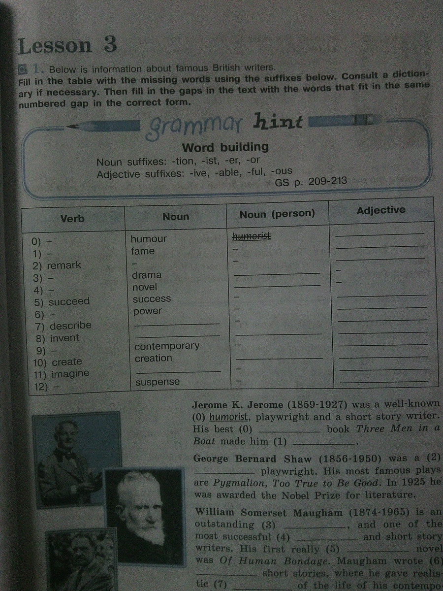 В рамочке надо написать слова, образованные от слов в самой левой колонке(если такие есть). Например,там, где прилагательные(adjectives) в первой строчке будет humorous. И так далее. В колонках adjectives и noun(person) слова образуются с помощью суффиксов, указанных выше. А потом надо вставить полученные слова в пропущенные места в тексте.