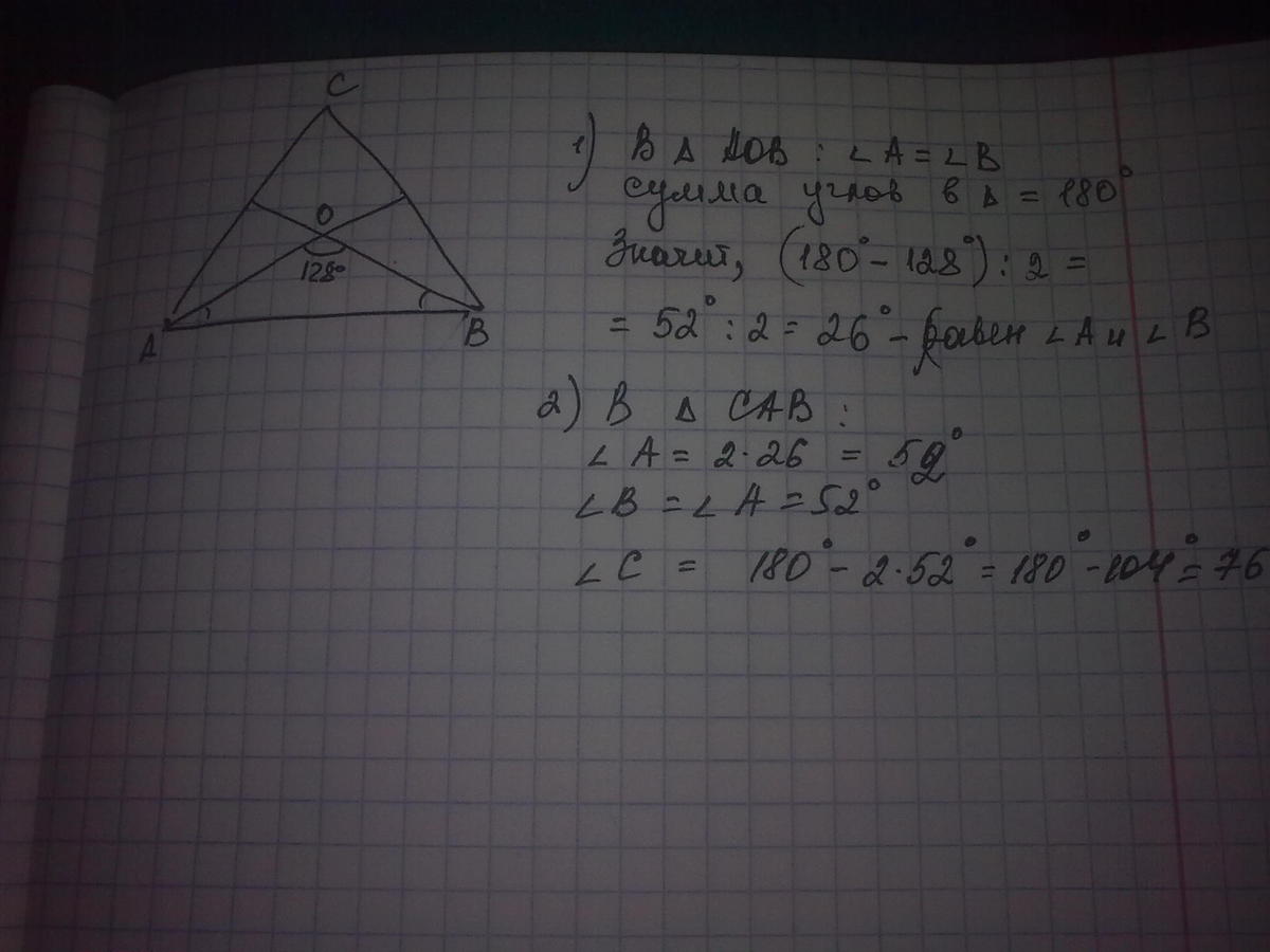 Рассмотрим треугольник с углом 128°. Пусть маленький угол А будет х, тогда маленький угол В тоже равен х (т.к. они равны)