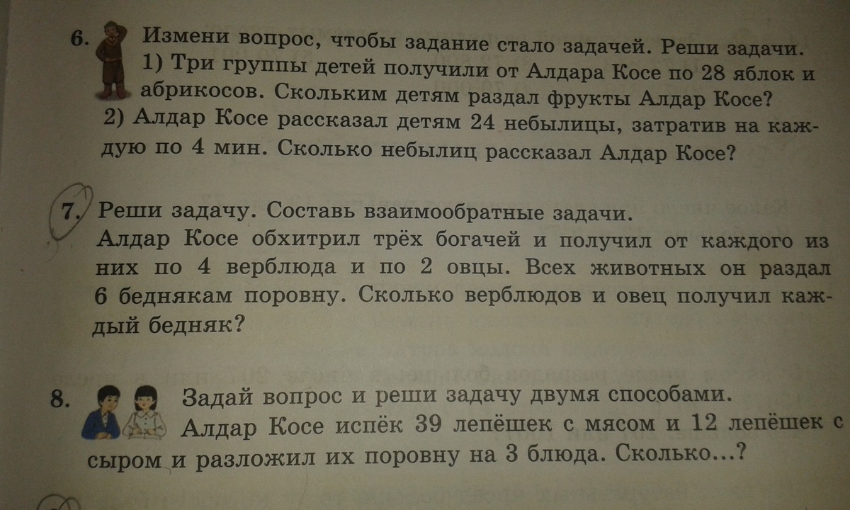 Алдар косе обхитрил трёх богачей и получил от каждого из них по 4 верблюда и по 2 овцы. Всех животных он раздал 6 беднякам поровну. Сколько верблюдов и овец получил каждый бедняк?