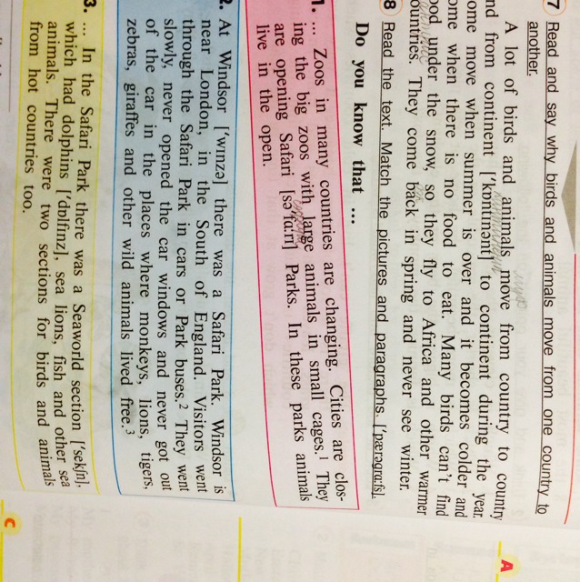 В Виндзоре И'винзе) был сафари-парк. Виндзор под Лондоном на Юге Англии. Посетители прошли сафари-парк в автомобилях или автобусах 2 Парка, Они медленно шли, никогда не открывали автомобильные окна и никогда не выходили из автомобиля в местах, где обезьяны, львы, тигр*, зебры, жирафы и другие дикие животные жили свободные.7. Рида и sav, почему птицы и животные перемещают от одного counjryjQ другого.Много птиц и животных двигается от страны до countn без обозначения даты с континента И'ннтмонт] на континент в течение года, ome движение, когда лето закончено, и становится холоднее и эте, когда нет никакой еды, чтобы поесть. Много птиц не могут найти> передозировка под снегом, таким образом, они летят в Африку и другой более теплый ountries. Они возвращаются весной и никогда не видят зиму.8 ReM - текст. Соответствуйте картинам и параграфам. Грдсгодга-fsl. Сделайте Вы знаете это...